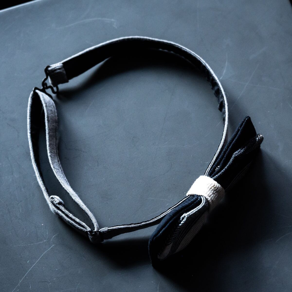 国産ソックスの厳しい品質基準を僅かに満たせず、エラーとなったニット素材を蝶ネクタイとしてアップサイクルしました。ソックスならではのきめ細かく表情豊かな織り柄素材の組み合わせは、ビジネスシーンにも日常使いにも合わせやすく、首元のアクセントとしてぴったりです。